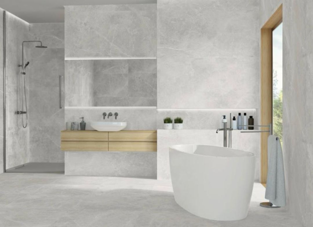 The Pietra Antica Cenere Matt brings contemporary elegance to life, with rectified precision and floor tiles.